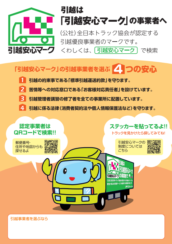 | 引越は、3月から4月にかけて依頼が集中します。 ピーク時期の引越を避けるなどの引越時期の分散に御協力をお願いします。 |