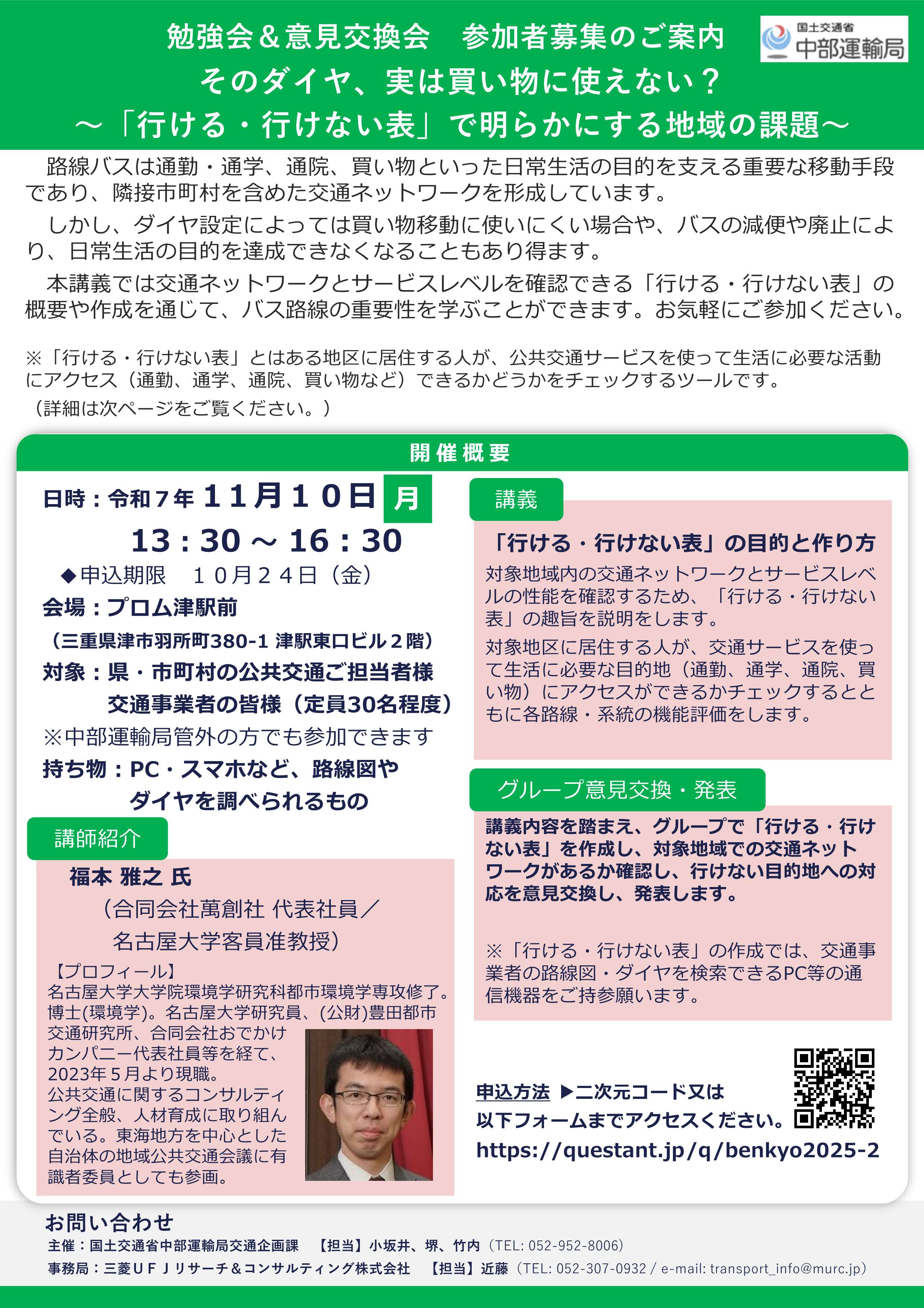 対象:県・市町村の公共交通ご担当者様 交通事業者の皆様 ※いずれも中部運輸局管外のご担当者様も参加できます。(定員30名程度) 主催:国土交通省中部運輸局交通企画課 日時:2025年11月10日(月)13:30〜16:30 ※申込期限10月24日(金) 会場:プロム津駅前(三重県津市羽所町380−1 津駅東口ビル2階) プログラム:1.講師による講義 講師:合同会社萬創社(名古屋大学客員准教授)福本 雅之 氏 2.グループ意見交換 3.発表・講評 申込方法:以下のフォームからお申し込みください。 https://questant.jp/q/benkyo2025-2 ※上記リンク先が開かなかった場合は、事務局へのeメールでお申し込みください。 参加者へのお願い PC・スマホなど、路線図やダイヤを調べられるものをお持ちください。 お問い合わせ 主催:国土交通省中部運輸局交通企画課 担当:小坂井、堺、竹内(TEL:052-952-8006) 事務局:三菱UFJリサーチ&コンサルティング株式会社 担当:近藤 (TEL:052-307-0932 / e-mail:transport_info@murc.jp) *―*―*―*―*―*―*―*―*―*―*―*―*―*―*―*―*―*―*―*―* << 意見等の募集について >> *―*―*―*―*―*―*―*―*―*―*―*―*―*―*―*―*―*―*―*―* ☆イベントの開催や取組み等、交通政策全般に関し、メールマガジンを通して広く情報発信 したい事項がございましたら、ご連絡ください。 ☆交通政策全般について、幅広く意見募集を行っています。内容は、メールマガジンの内容 に関するものでなくとも、交通に関するものであれば何でも結構です。 頂いたご意見は、中部運輸局の判断により国土交通本省に報告させていただく場合があり ます。またその場合は、いただいたご意見を回答とともにメールマガジンにてご紹介させ ていただきます。 (掲載等を希望しない場合は、あらかじめその旨お知らせください。) 〜〜〜〜〜〜〜〜〜〜〜〜〜〜〜〜〜〜〜〜〜〜〜〜〜〜〜〜〜〜〜〜〜〜〜〜〜〜〜〜〜 ☆中部運輸局ホームページ http://wwwtb.mlit.go.jp/chubu/ ☆自治体担当者のための『地域公共交通サポートデスク』 https://wwwtb.mlit.go.jp/chubu/tsukuro/keikaku/index.html ☆中部運輸局公式X(旧Twitter) https://x.com/chubu_unyukyoku ☆『創ろう!みんなの交通』メールマガジン バックナンバー https://wwwtb.mlit.go.jp/chubu/tsukuro/mail/index.html ☆総合交通メールマガジン(国土交通省 総合政策局 総務課 総合交通体系担当) https://www.mlit.go.jp/sogoseisaku/soukou/seisakutokatsu_soukou_tk_000005.html 〜〜〜〜〜〜〜〜〜〜〜〜〜〜〜〜〜〜〜〜〜〜〜〜〜〜〜〜〜〜〜〜〜〜〜〜〜〜〜〜〜 本メールマガジンはご登録のアドレスに送信しております。広く愛読していただくため、 都市計画、環境、物流、福祉などの関係部署がございましたら、団体内で展開・紹介して いただけると幸いです。