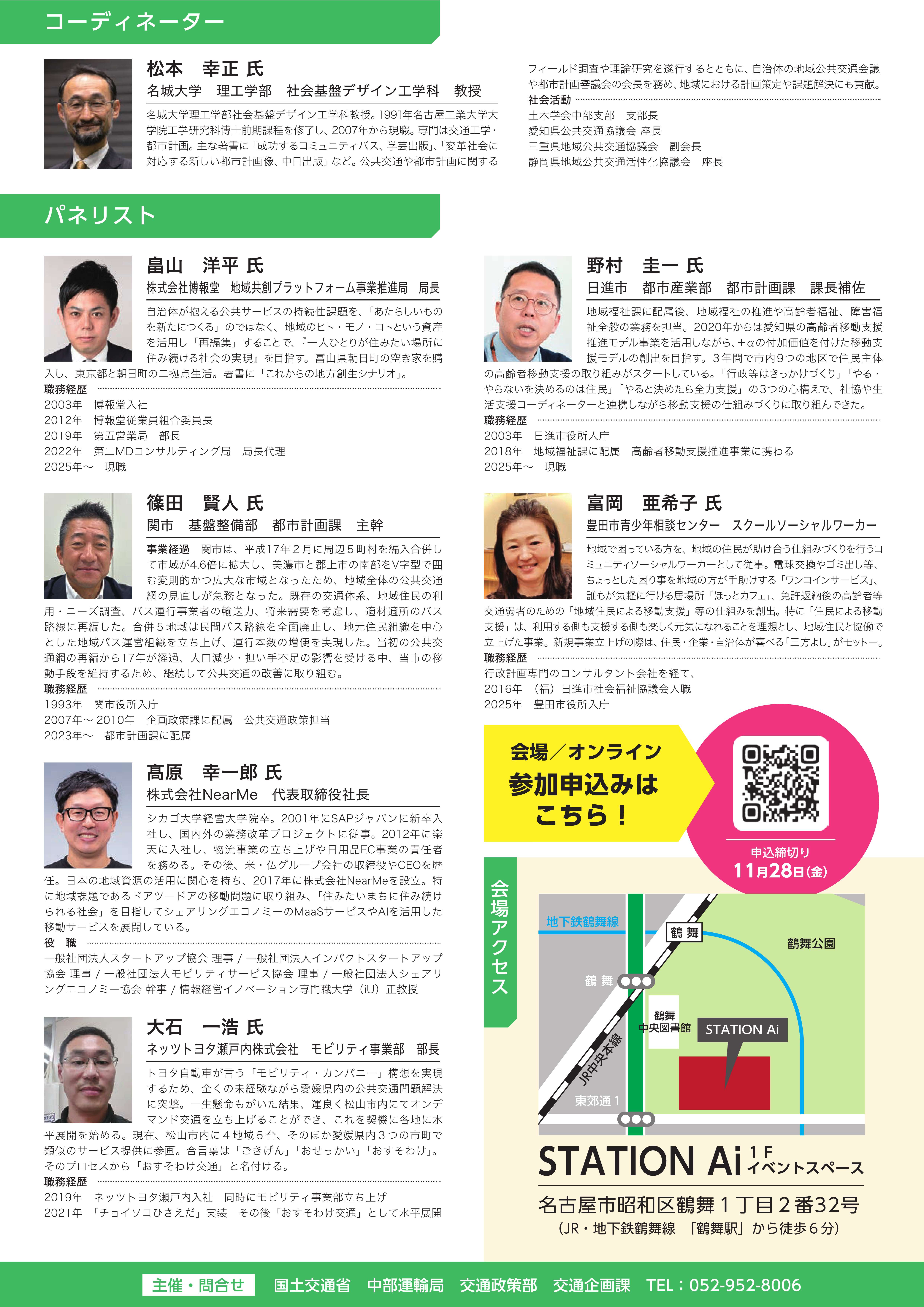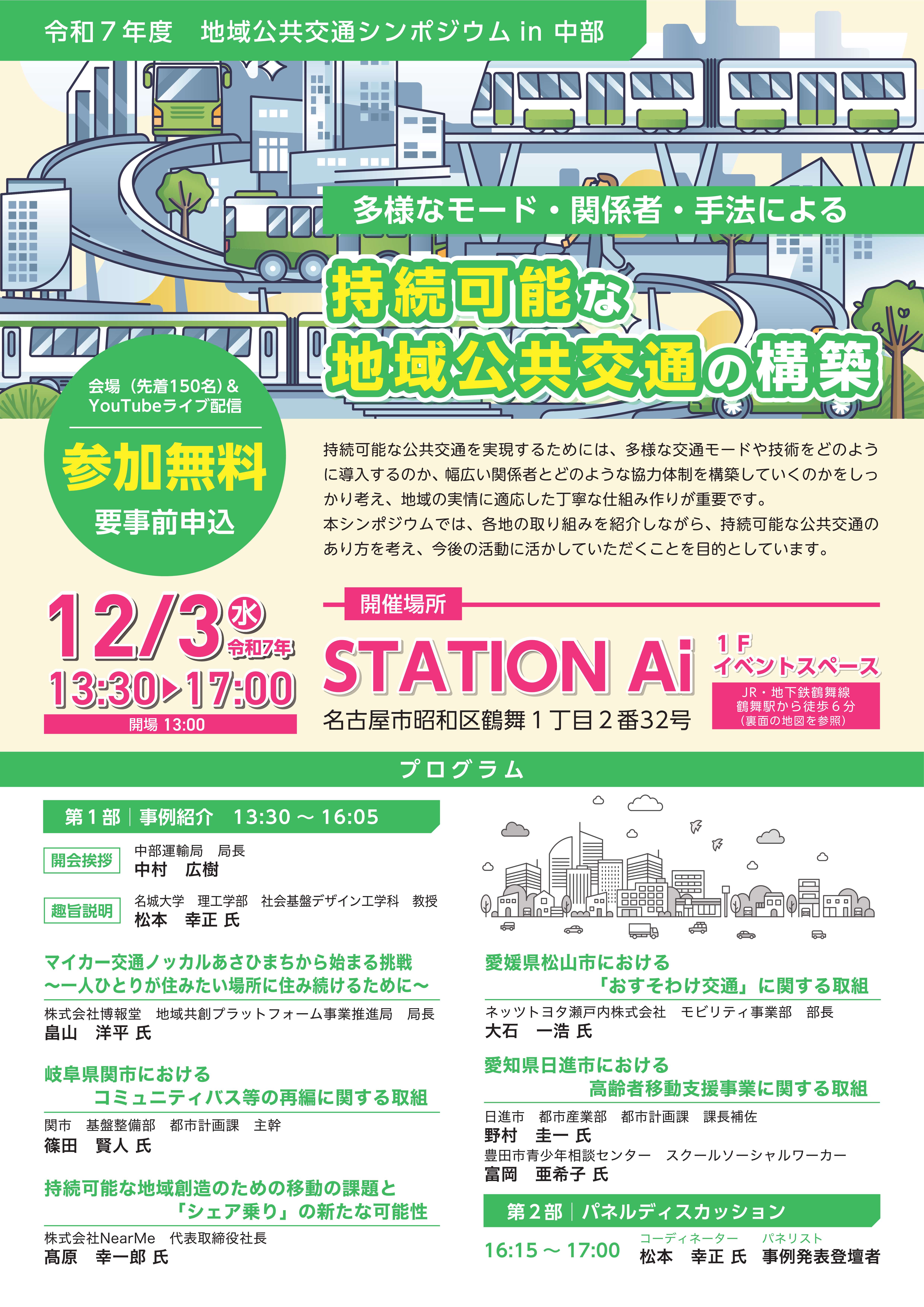 ●プログラム 【第1部】 事例紹介 ◆株式会社博報堂 地域共創プラットフォーム事業推進局 局長 畠山 洋平 氏 「マイカー交通ノッカルあさひまちから始まる挑戦 〜一人ひとりが住みたい場所に住み続けるために〜」 ◆岐阜県関市 基盤整備部都市計画課 主幹 篠田 賢人 氏 「岐阜県関市におけるコミュニティバス等の再編に関する取組」 ◆株式会社NearMe 代表取締役社長 原 幸一郎 氏 「持続可能な地域創造のための移動の課題と「シェア乗り」の新たな可能性」 ◆ネッツトヨタ瀬戸内株式会社 モビリティ事業部 部長 大石 一浩 氏 「愛媛県松山市における「おすそわけ交通」に関する取組」 ◆愛知県日進市 都市産業部都市計画課 課長補佐 野村 圭一 氏 豊田市青少年相談センター スクールソーシャルワーカー 富岡 亜希子 氏 「愛知県日進市における高齢者移動支援事業に関する取組」 【第2部】 パネルディスカッション コーディネーター:名城大学 理工学部 社会基盤デザイン工学科 松本 幸正 教授 パネリスト :事例紹介の発表者 ──────────────────────────────────────────── [2](全)11月10日、公共交通に関する勉強会(津市)開催のお知らせ そのダイヤ、実は買い物に使えない? -「行ける・行けない表」で明らかにする地域の課題- ──────────────────────────────────────────── 路線バスは通勤・通学、通院、買い物といった日常生活の目的を支える重要な移動手段であり、 隣接市町村を含めた交通ネットワークを形成しています。 しかし、ダイヤ設定によっては買い物移動に使いにくい場合や、バスの減便や廃止により、日常 生活の目的を達成できなくなることもあり得ます。 本講義では交通ネットワークとサービスレベルを確認できる「行ける・行けない表」の概要や 作成を通じて、バス路線の重要性を学ぶことができます。お気軽にご参加ください。 ※「行ける・行けない表」とは、ある地区に居住する人が公共交通サービスを使って生活に必要な 活動にアクセス(通勤、通学、通院、買い物など)できるかどうかをチェックするツールです。 勉強会の詳細は以下のURLをご確認ください。 https://wwwtb.mlit.go.jp/chubu/oshirase/kousei2025100101.pdf