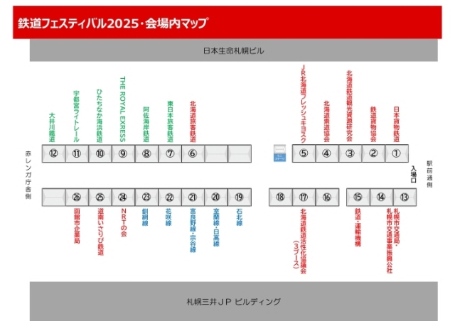 北海道旅客鉄道(株)、道南いさりび鉄道(株)、日本貨物鉄道(株)北海道支社、札幌市交通局、(一財)札幌市交通事業振興公社、函館市企業局、北海道索道協会、(独)鉄道建設・運輸施設整備支援機構、北海道鉄道活性化協議会、北海道鉄道観光資源研究会、JR北海道フレッシュキヨスク(株)、NRTの会、(公財)鉄道貨物協会、JR室蘭線活性化連絡協議会、 JR北海道の維持困難線区に関する東胆振首長懇談会、 JR富良野線連絡会議、宗谷本線活性化推進協議会、オホーツク圏活性化期成会石北本線部会(JR石北本線応援団)、 JR釧網本線維持活性化実行委員会・ひがし北海道鉄道研究会、根室市・根室本線花咲線対策沿線地域連絡協議会・夢空間☆花咲線の会、東日本旅客鉄道(株)盛岡支社、大井川鐵道(株)、THE ROYAL EXPRESS、宇都宮ライトレール(株)、阿佐海岸鉄道(株)、茨城県地域鉄道(ひたちなか海浜鉄道(株))(順不同) |