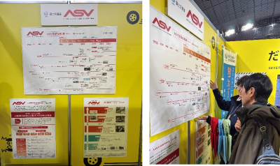 先進技術を利用して安全運転に資するシステムを搭載したASV(先進安全自動車)について、パネル展示を行いました。最初は「これは何の展示?」といった雰囲気で眺めていたお客様も、「自動車に搭載されている安全運転を支援するシステムなどについて展示しています」と説明すると、
