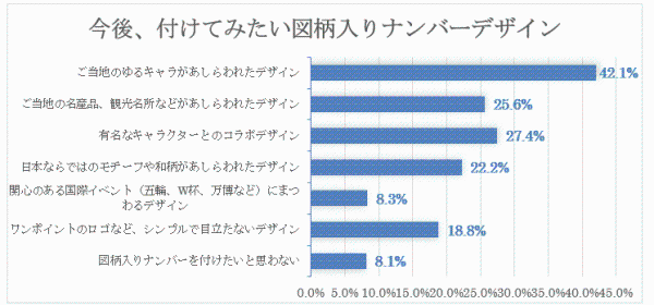 今後、付けてみたい図柄のアイデアとして最も支持が多かったのは「ご当地のゆるキャラがあしらわれたデザイン」(42.1%)、次いで「有名なキャラクターとのコラボ」(27.4%)となりました。