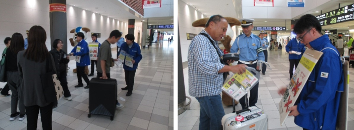 今回は、北海道警察本部、札幌方面千歳警察署、北海道、千歳市、(一社)北海道ハイヤー協会、千歳地区ハイヤー事業協同組合の協力をうけ実施しました。 当日は北海道運輸局の旅客第二課3名・自動車監査官1名が、他の協力機関の参加者とともに新千歳空港に到着した旅行者に啓発用リーフレットやポケットティッシュなどの啓発グッズを配りました。