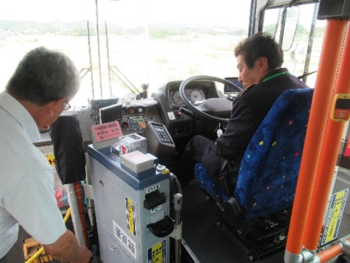 運転体験会では各企業のご協力によりバス、タクシー、トラック計6台が用意され、バスとトラックでは運転体験を、タクシーについては車内設備を見学していただきました。