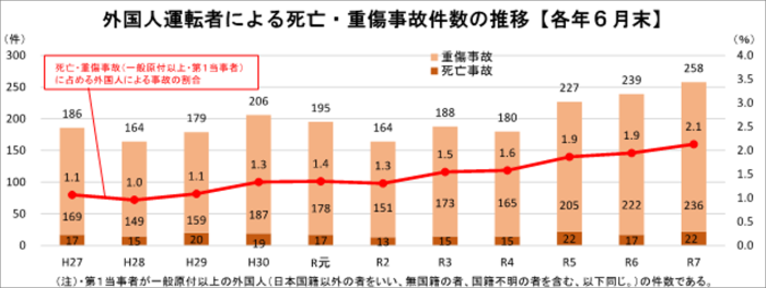 警察庁の統計によると、直近では死亡・重傷事故が258件、全体の2.1%を占め、過去最高を記録しました。国籍別では韓国・朝鮮、中国、ベトナム、ブラジル、フィリピンが約7割を占めています。背景には交通ルールや道路環境の違い、冬季の路面状況への不慣れなどがあり、事故防止は喫緊の課題です。