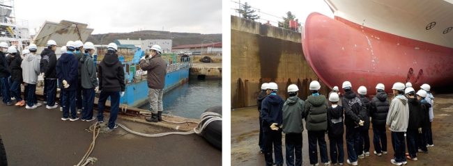 造船所では乾ドックや上架中の船舶を見学。乾ドックとは、船の建造・修理のために水を抜けるように作られた施設です。実際に乾ドックに降り立った生徒たちは、船の大きさに圧倒されていました。