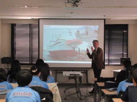 今回の取り組みは、将来の担い手となる中学生に海事産業の魅力を伝えることが目的です。 講座では、海事振興部の高石船舶産業振興官が講師を務め、日本の海運の重要性や造船所の役割について、見学先である稚内港湾施設(株)の紹介を交えながら約40分間の講義を実施しました。