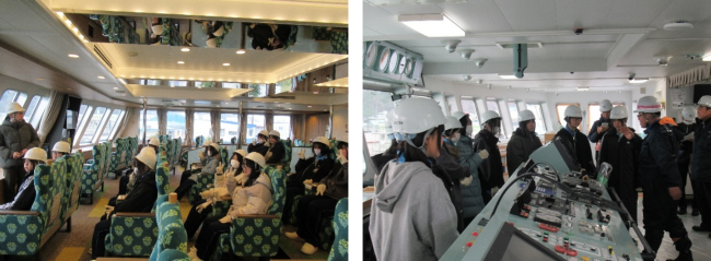 フェリーの船内見学では、船員食堂やブリッジなど普段は入れないエリアを見学。特にブリッジには多くの機器、そして無数のスイッチがあり、それらに目を輝かせる生徒たちの姿が印象的でした。