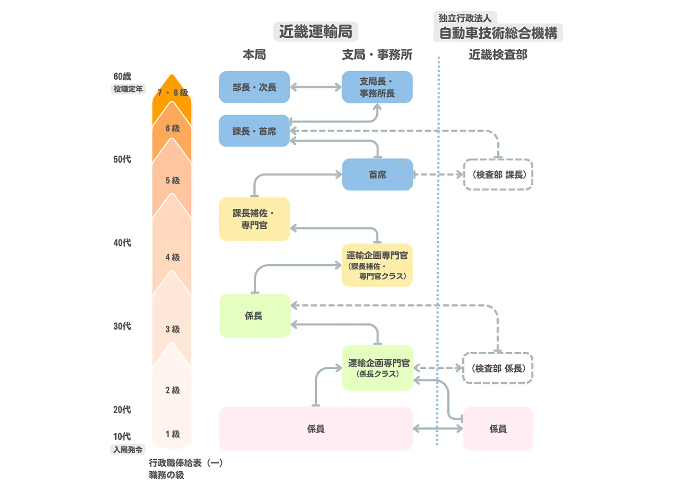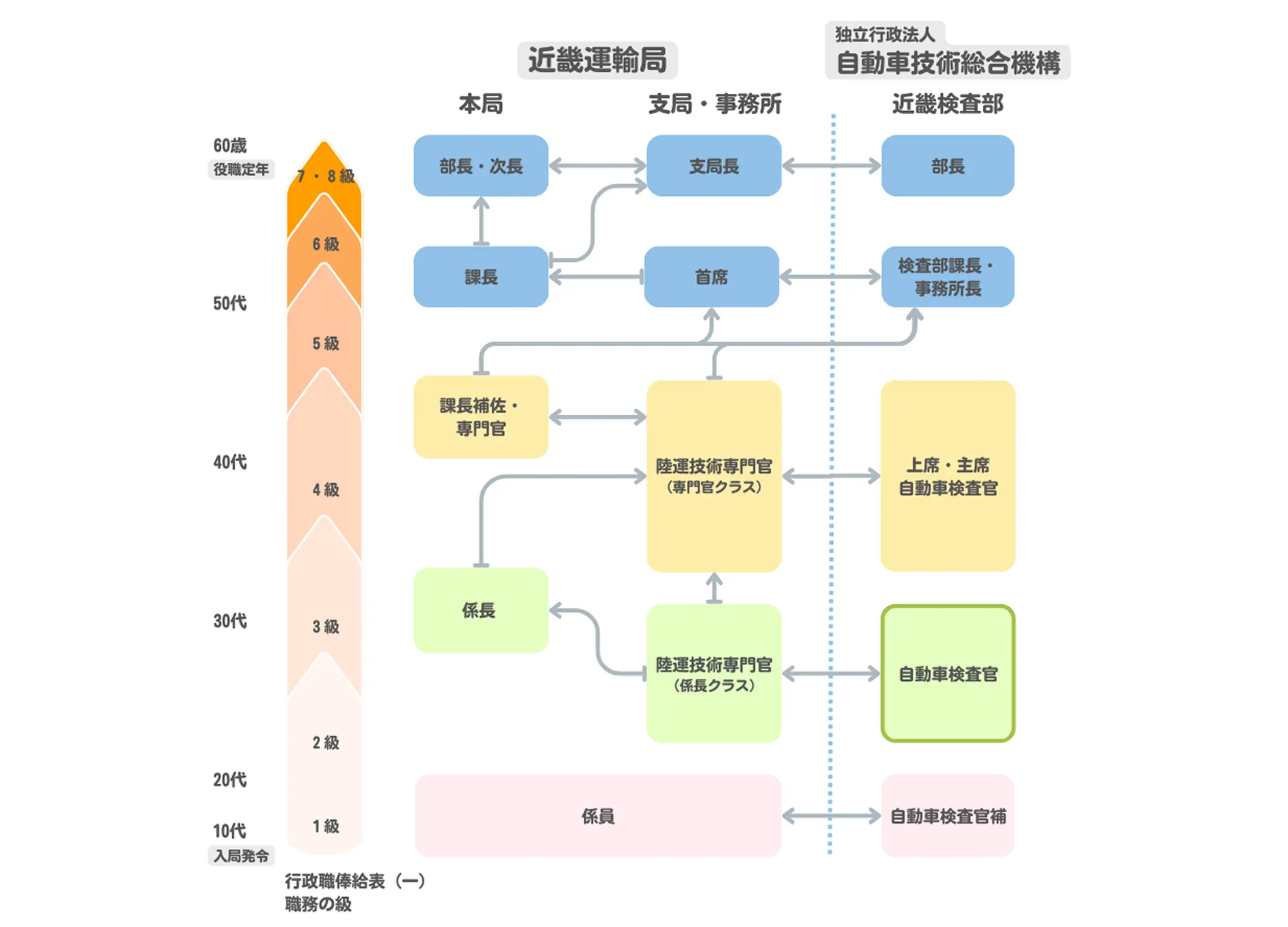 大学・高校卒業後、国家公務員一般職試験(大卒程度・高卒者)に合格し、国や機構の支局等で自動車(検査・整備)などの部署に配属されます。