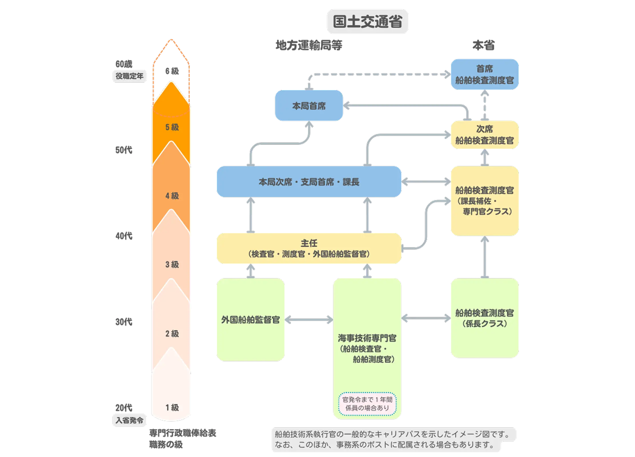 高専卒業後、国家公務員一般職試験(大卒程度)の合格のほか、大学編入を経て、または大学卒業後、国家公務員一般職試験(大卒程度)に合格し、海事技術分野に進む道があります。