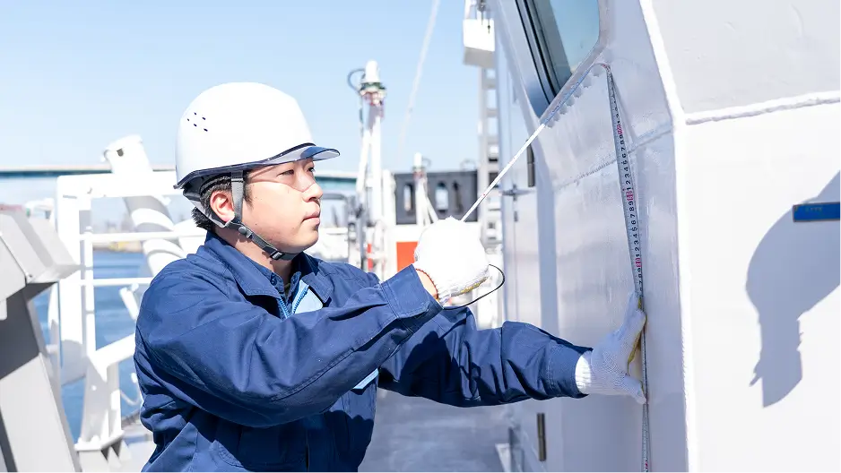 また、船の「トン数」を決定する「測度(そくど)」も重要な任務です。トン数とは「重さ」のことではなく、その船の大きさを表す指標のことで、安全基準の適用や税金の額を決めるための大切な基礎となっています。私たちは図面上だけでなく、実際に完成した船に赴き正確な計測を行います。