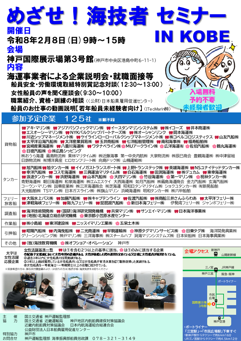 神戸運輸監理部は、船員になりたい方・船員の仕事を探している方と、海運事業者の雇用のマッチングを支援するため、企業説明と就職面接を兼ねた「めざせ!海技者 セミナーIN KOBE」を開催します。