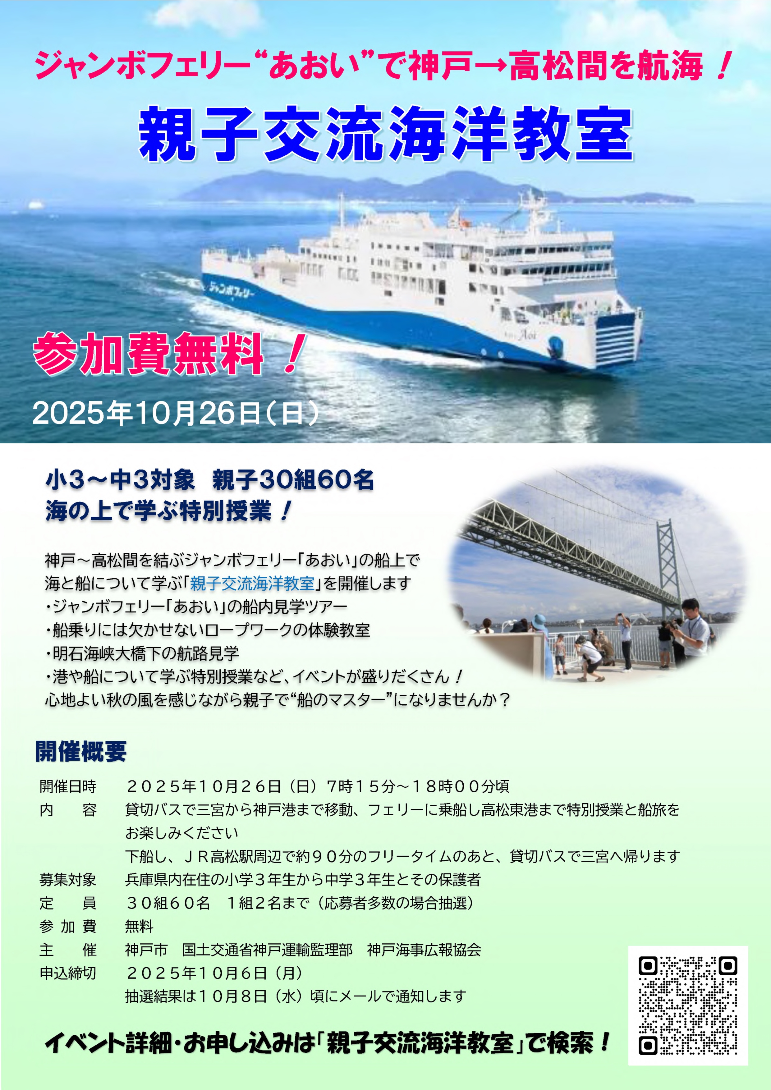 神戸運輸監理部では、子供たちに港・船の役割や船員の仕事を知ってもらうため、様々なイベントを実施しています。このたび、神戸市及び公益社団法人神戸海事広報協会と共催で、ジャンボフェリーで神戸から高松へ航海しながら港・船について学ぶ、毎年大好評の「親子交流海洋教室」を開催します。2022年10月に就航したジャンボフェリーの「あおい」に乗船し、普段は入れない操舵室をはじめとする船内を見学するバックヤードツアーや港・船について学ぶ特別授業、船乗りには欠かせないロープワークの体験教室など、心地よい秋の風を感じながら船の魅力に引き込まれるイベントが盛りだくさんです。参加費は無料ですので、皆様からの多くのご応募をお待ちしております。