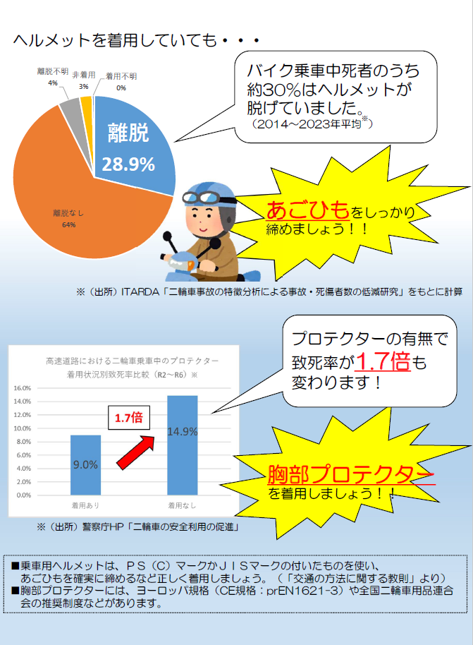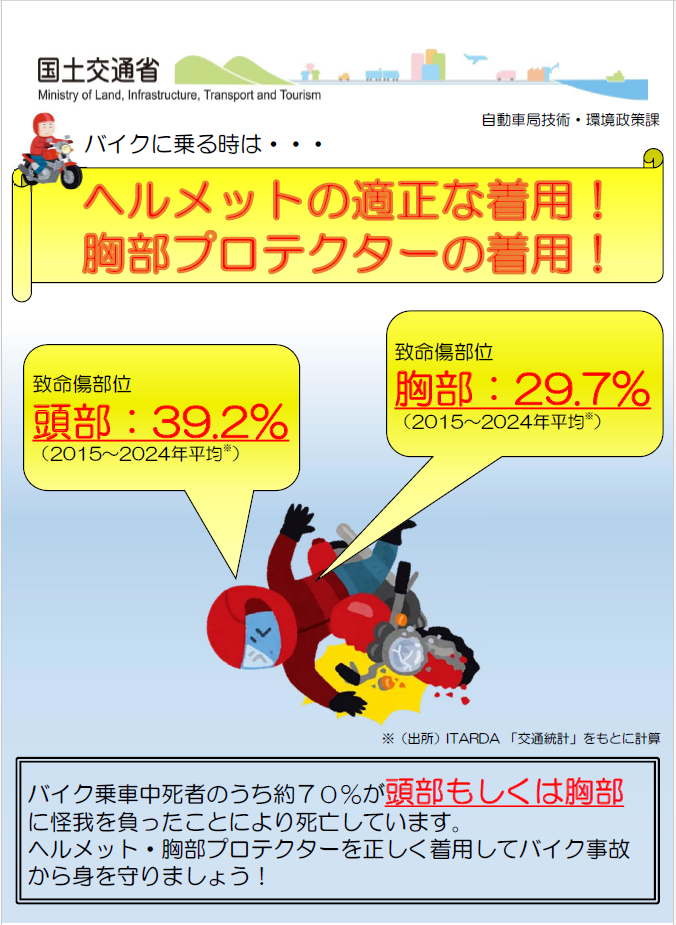 事故が発生時した際に皆様の体を守るためにも、二輪車乗車時におけるヘルメットの適正な着用ならびに、胸部プロテクターの着用にご協力を頂けますようお願いします。