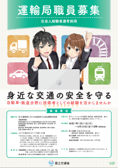国土交通省では、地方運輸局等において、海事関係法令に基づく船舶・舶用機関及び船舶用品の検査の執行、日本に入港する外国船舶の監督(ポート・ステート・コントロール)、船舶のトン数の決定のための船舶の測度の実施等、我が国の船舶の安全環境行政全般にわたる業務を担当する船舶関係技術職員の採用希望者を広く募集いたします。