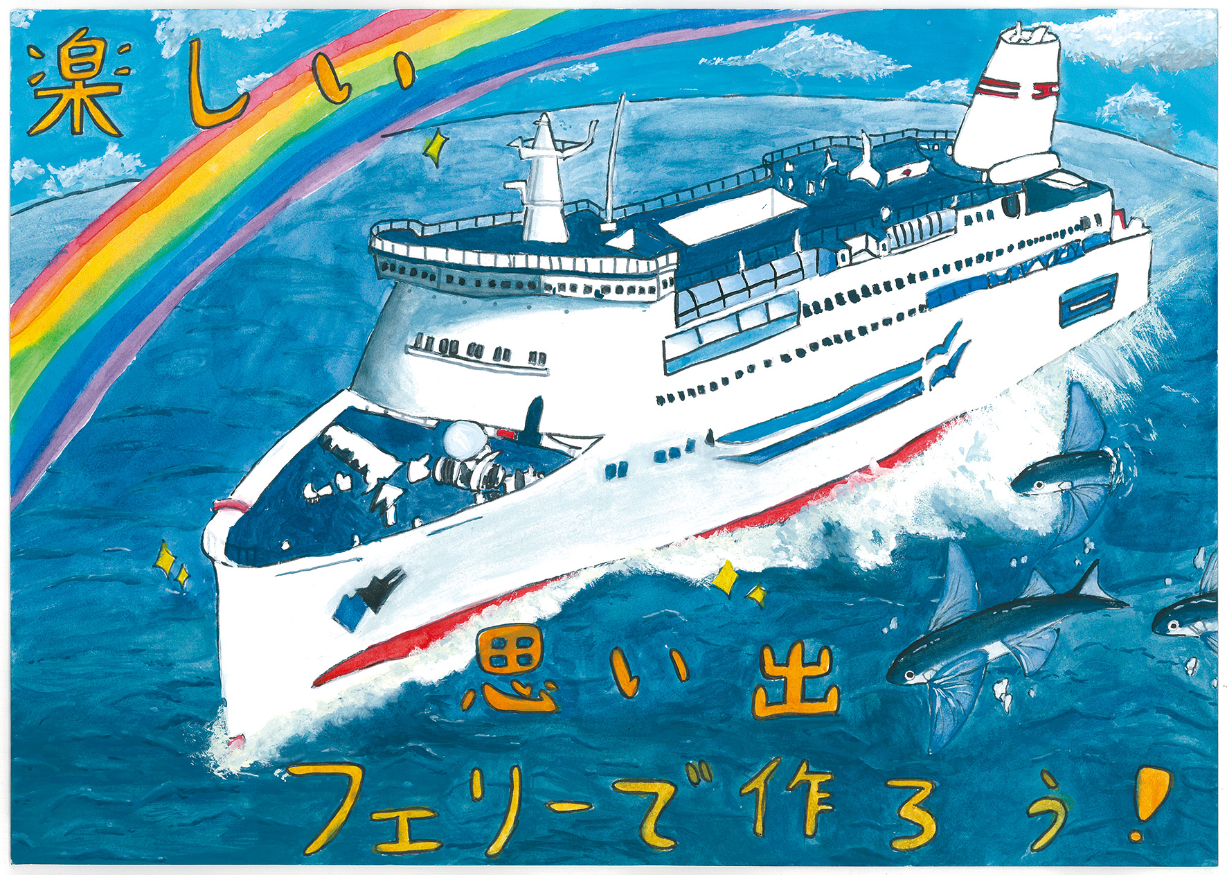 海の青と文字のオレンジのコントラストが印象的で、フェリーを大きく描いている点もとても映える作品だと感じました。
