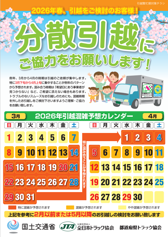 | 引越は、3月から4月にかけて依頼が集中します。 ピーク時期の引越を避けるなどの引越時期の分散に御協力をお願いします。 |