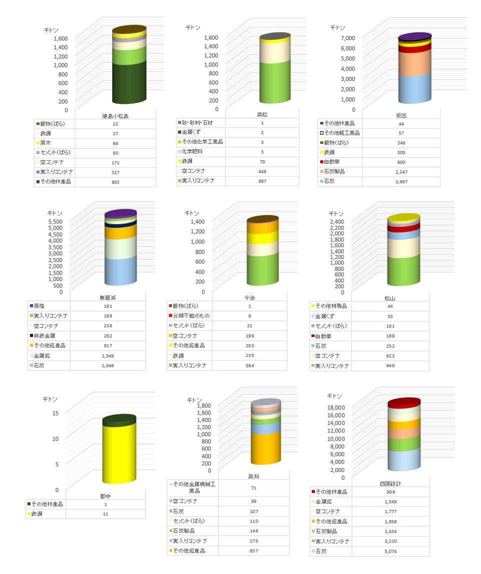 ■令和6年度四国運輸局管内船舶積卸し実績(主要品目別) ![]() (注)千トン未満を四捨五入しているため、合計が一致しないことがある。 |