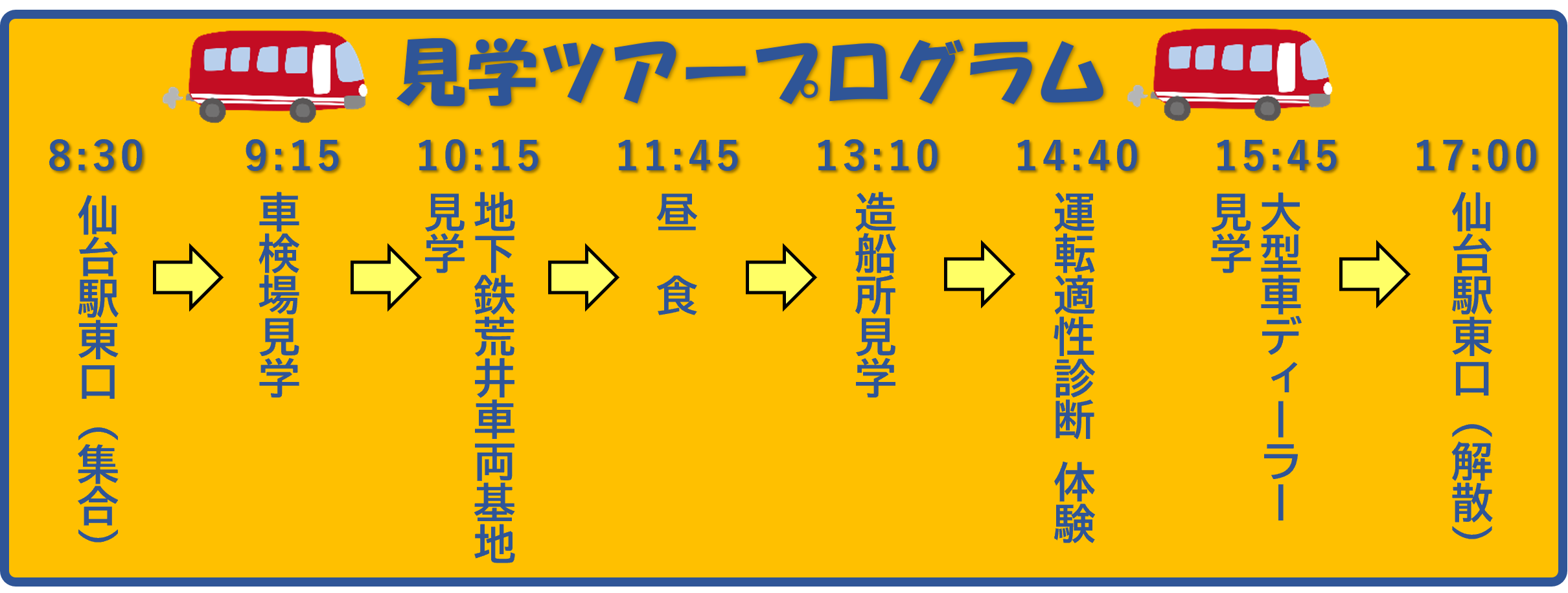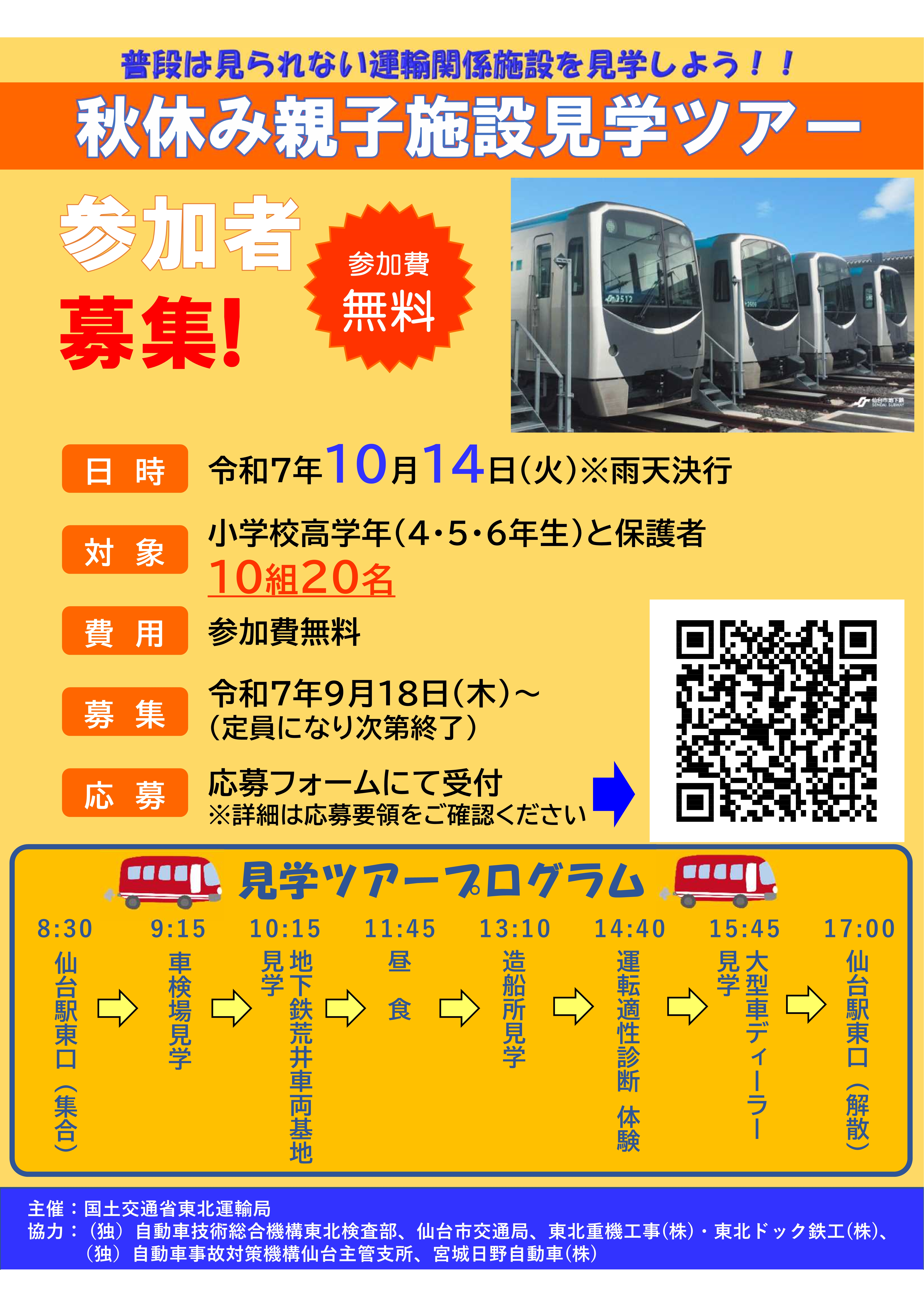 国土交通省東北運輸局では、小学校高学年(4・5・6年生)を対象に運輸産業の現場や施設を見学・体験していただきながら、運輸関係業界の仕事に理解を深めていただくために、秋休み親子施設見学ツアーを実施します。