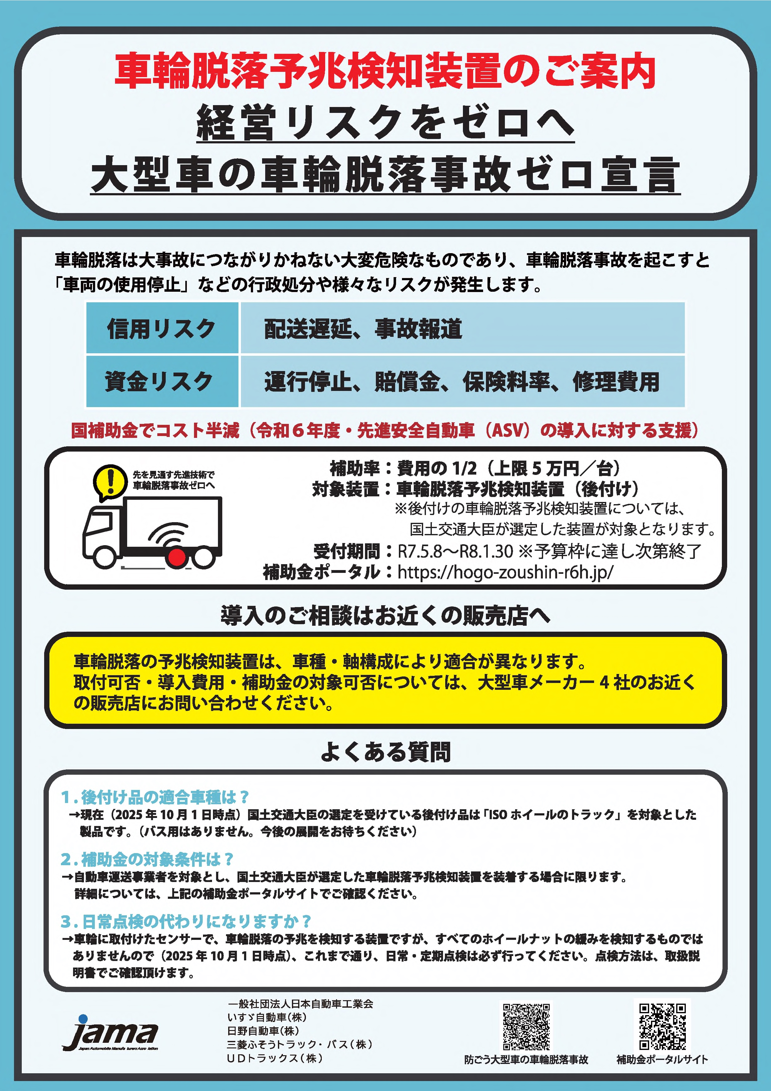 近年「車輪脱落予兆検知装置」が開発され、安全の確保のみならずドライバーの負担軽減も期待されます。