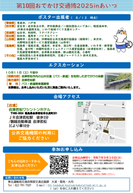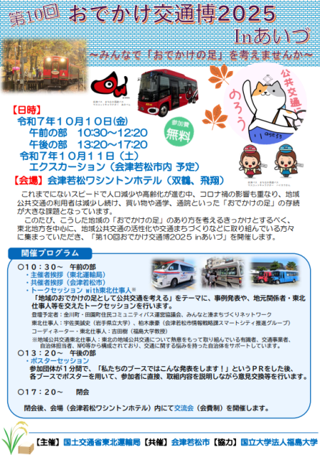 地域公共交通の確保・維持・改善や交通まちづくり、新たなモビリティサービスの実装などに精力的に取り組む方々が集い、トークセッションやポスターセッション等を通じて成果や悩みを共有することにより、人的ネットワークの構築を促進するとともに、聴講された方々の地域における「おでかけの足」のあり方を考える契機とし、東北地方における地域公共交通の活性化に向けた取組の促進を図るため、東北運輸局では例年「おでかけ交通博」を開催しております。