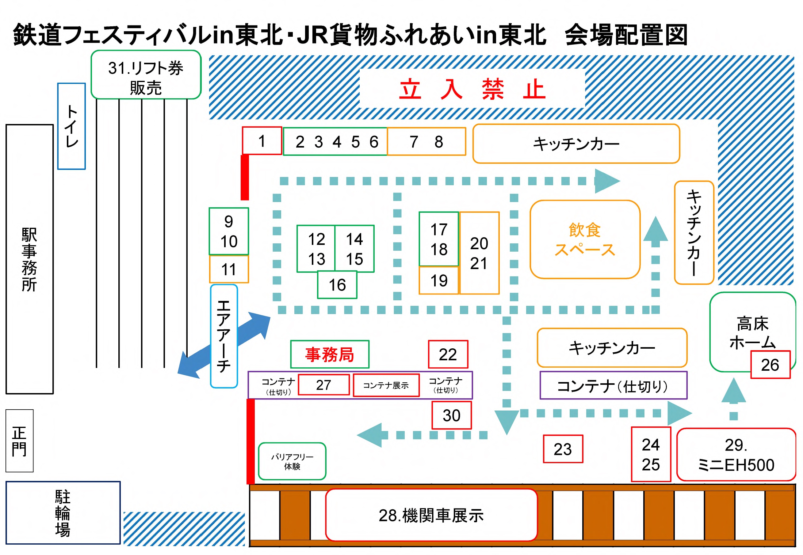 ・イベント中も駅構内では荷役作業などを実施しています。事故防止のためフェスティバルエリア外への立ち入りは禁止です。